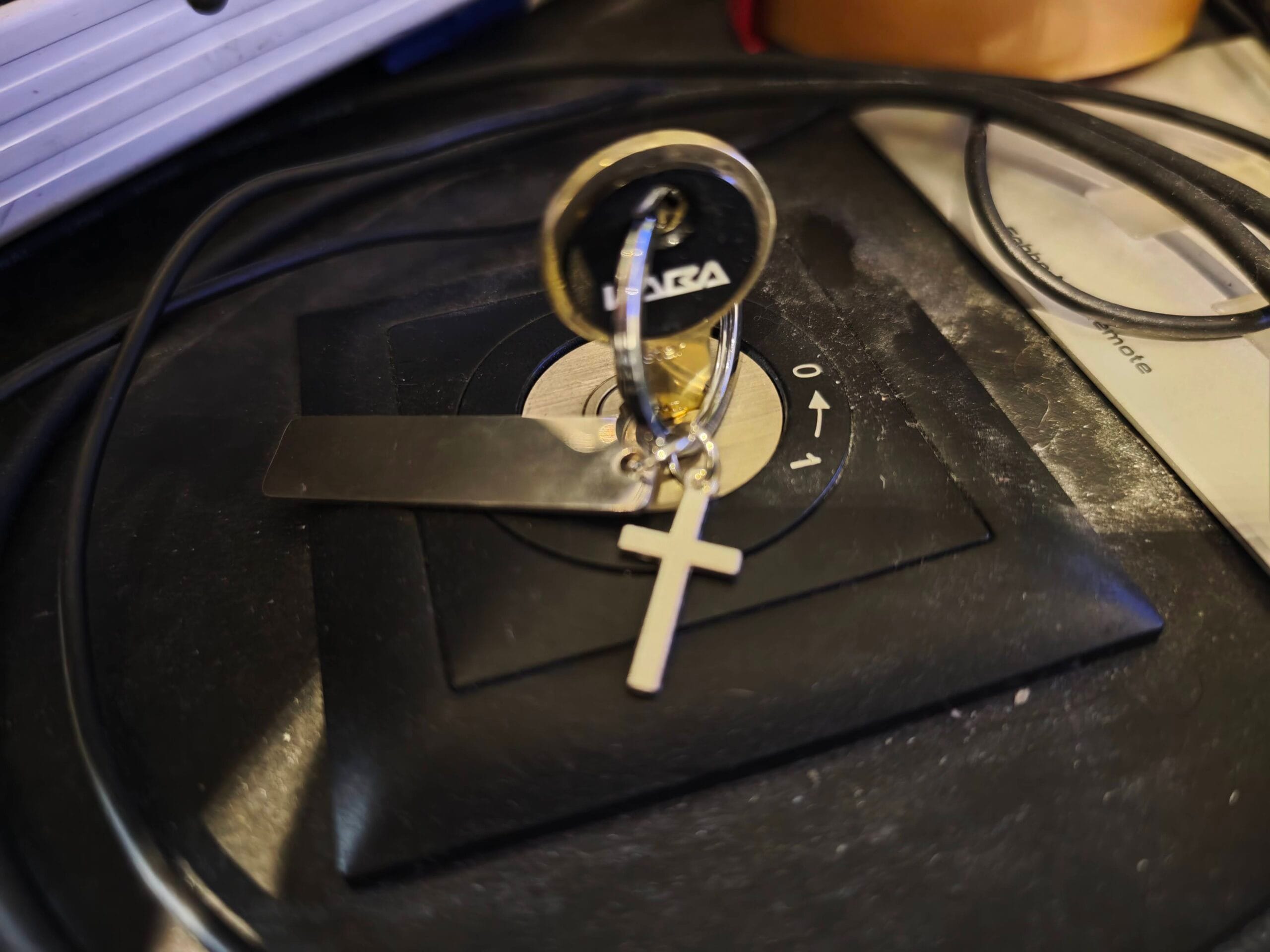 Powering up the stage outlets, foyer TV, confidence TV, and production desk requires a Master Key. This key looks like the keys that unlock the church door, but additionally unlocks the cabinets in the backstage room, the cabinets on either end of the production desk, and in the power key switch next to the soundboard. Unlike the door keys, this key is stamped with the letter MT.
