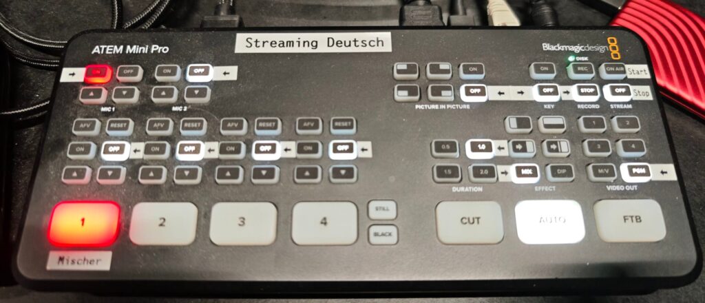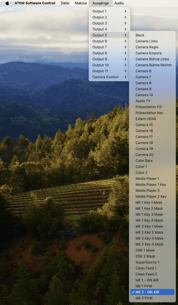 FEG likes to display the camera feed on the main projector, while IBF prefers to only display the slide content. To make this happen, with ATEM Software Control selected, click Ausgänge on the top menu bar, then click Output 5, then select ME 2 – ON AIR.