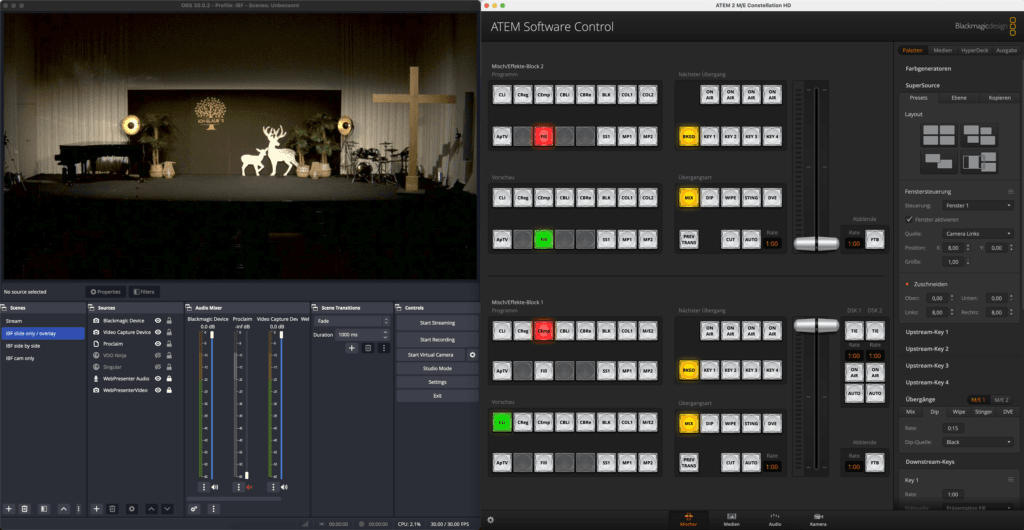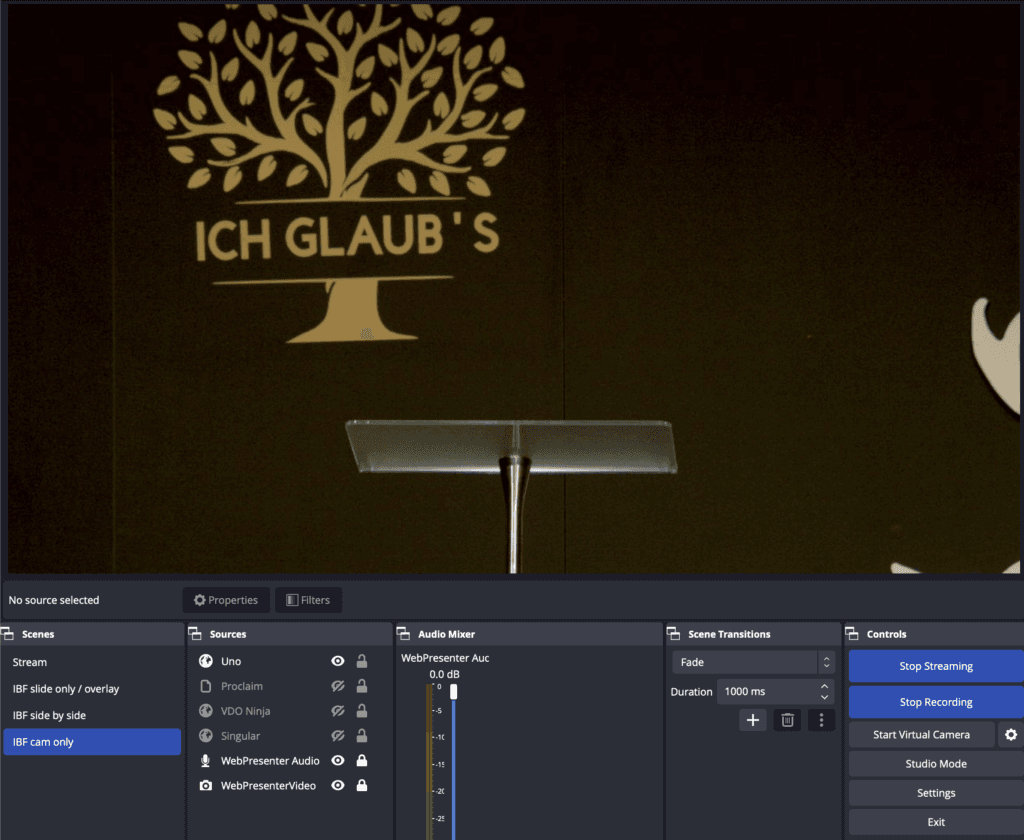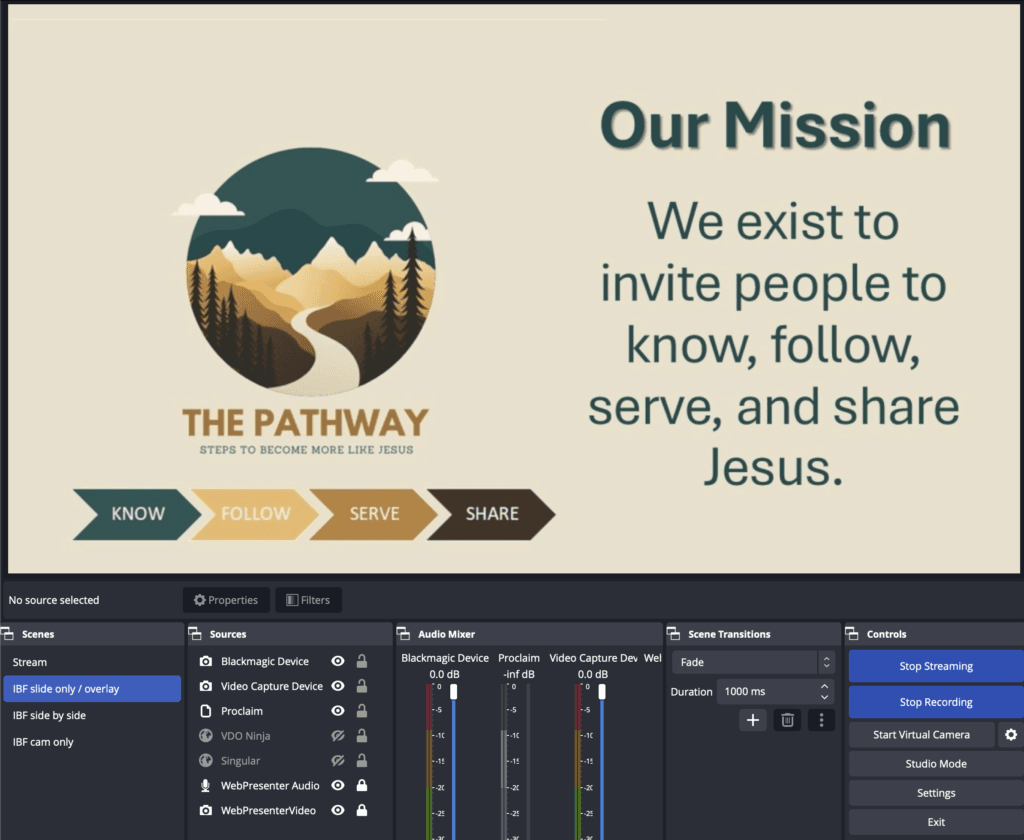For most of the service (aside from praise & worship), IBF side by side might be the most useful scene. This places a cropped camera image on the left and the slide content on the right.