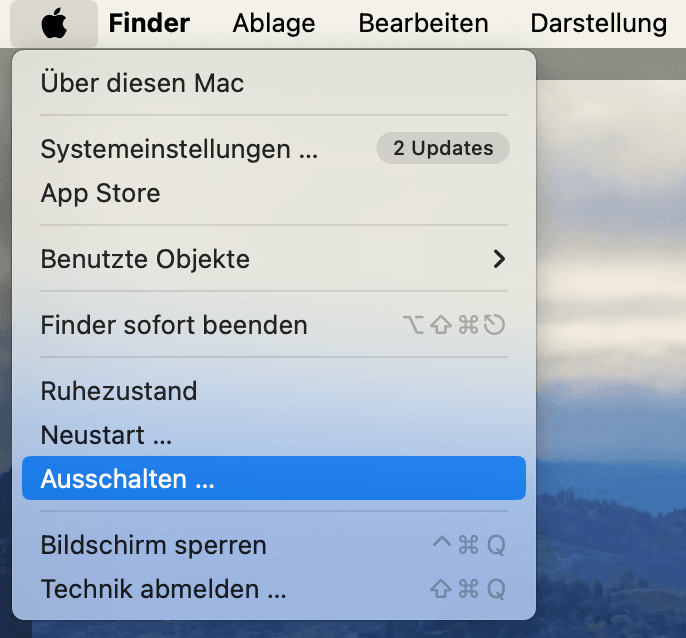 To shut down the iMac, click the Apple at the top left of the screen, then click Ausschalten … and confirm this in the pop-up window.