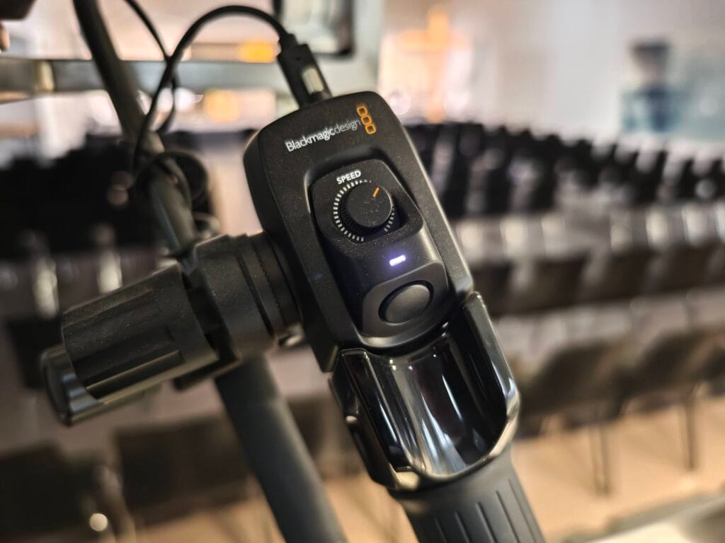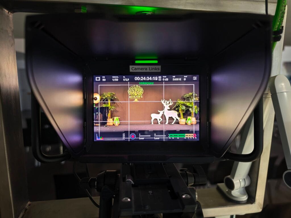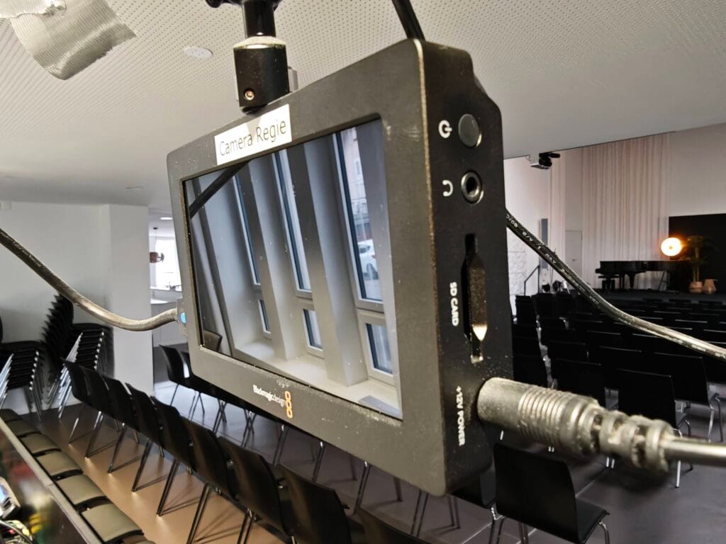 There are 3 viewfinders like the one shown here—2 on the desk and 1 mounted below the Regie camera. Power them on by pressing the power button on the top right side of the screen.